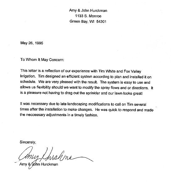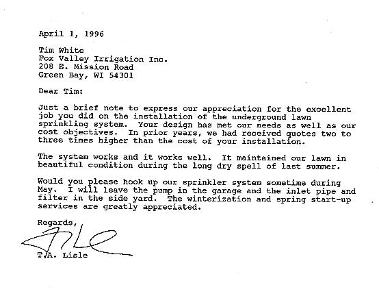 At Fox Valley Irrigation we are proud to supply you a list of references both commercial and residential. By being the contractor of choice for marquee area projects such as the new Bay Port High School grounds, Fox Valley Irrigation demonstrates our reputation for reliable and responsible service and installation. Click on the images below to see some of the testimonials and letters of thanks from our customers. If you would like additional references or examples of our work, please feel free to contact us by phone or email..